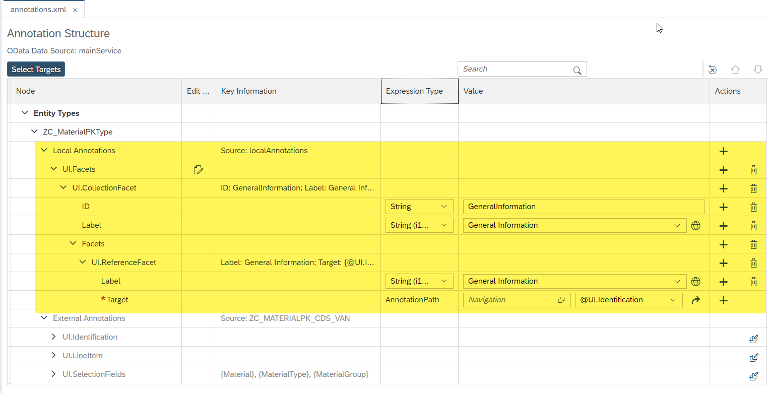 Note: Local annotation overrides annotation coming from CDS (external annotation). You can see in screenshot @UI.Facet annotations from CDS are crossed over.