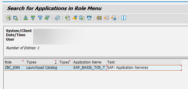 This will give you Tile Catalog name (SAP_BASIS_TCR_T) and PFCG role name, ZBC_EXN in this particular case.