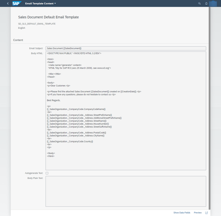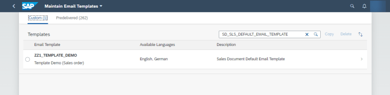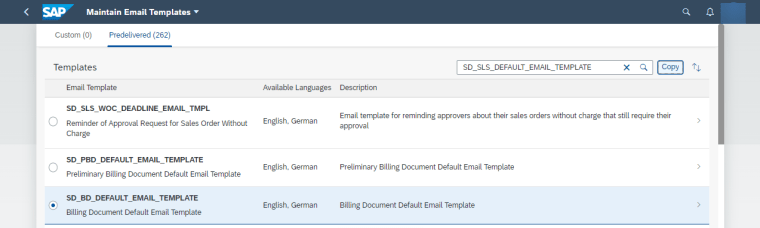 In the app, you can see predelivered templates, CDS name, all data fields which can be used in subject and body. You can also see the contents which can be changed after copying.