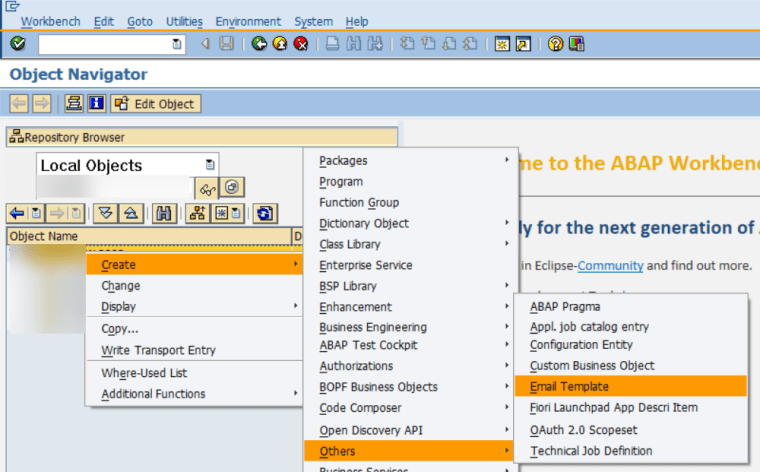 I can create an Email Template from SE80 (or probably Eclipse – I haven’t checked). Follow the path as shown in the below screenshot.