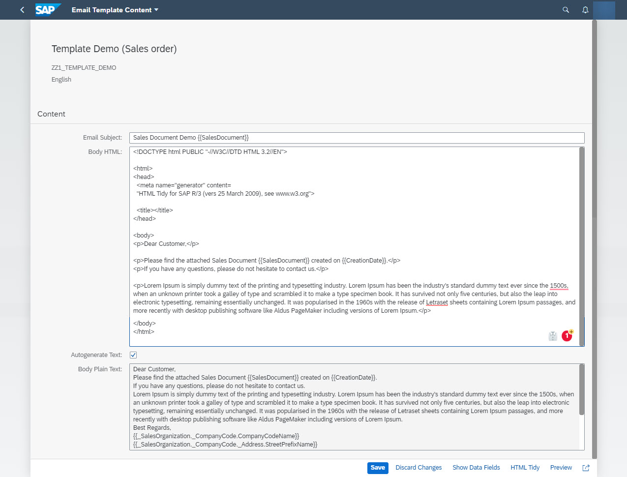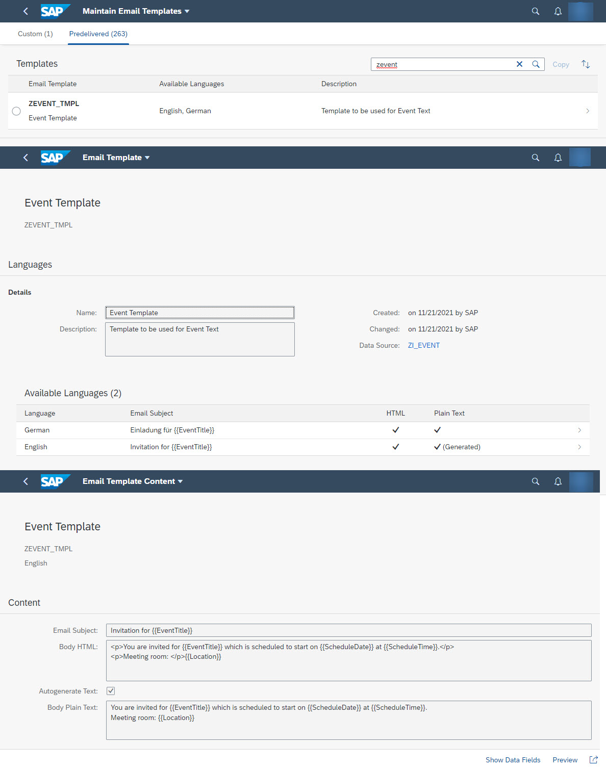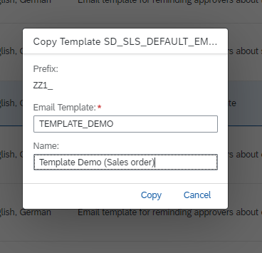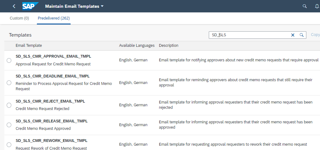 In the app, you can see predelivered templates, CDS name, all data fields which can be used in subject and body. You can also see the contents which can be changed after copying.