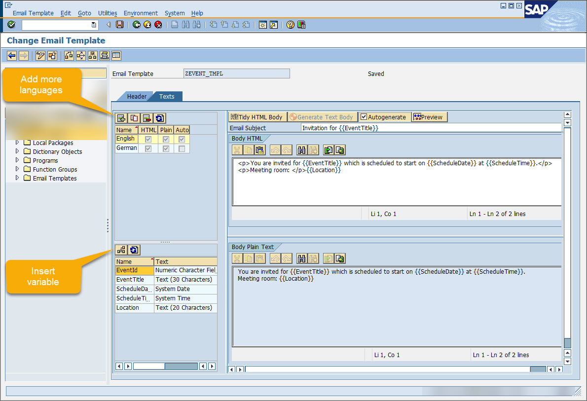Templates are defined in two layers. In the first layer, developers create a template assigned CDS view from which the template can derive values (in both subject and contents). Also in this step, the initial subject and contents are defined in different languages. In the second layer, the user makes a copy of the predefined template following which subject and content can be changed. Users can also use any variable from CDS that was attached to the template by the developer. These variable placeholders are replaced by values at runtime (very much like the mail merger feature in MS Word). Translation in more languages can be added or removed, as desired.