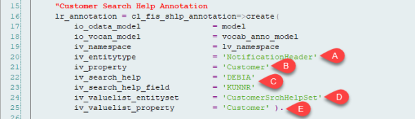 (A)NotificationHeader is entity which has field (B)Customer where we I like to add value help. (C)DEBIA is the name of search help and (C)KUNNR is the field in search help which will return key value, which is customer number. (D)CustomerSrchHelpSet is the entity set which will provide data for search help list and (E)Customer is the field in CustomerSrchHelpSet which will contain value for customer number.